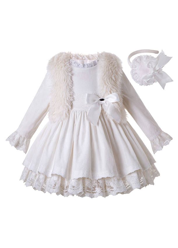 3 Pieces White Lace Corduroy Cotton Girls Autumn Dress Faux Fur