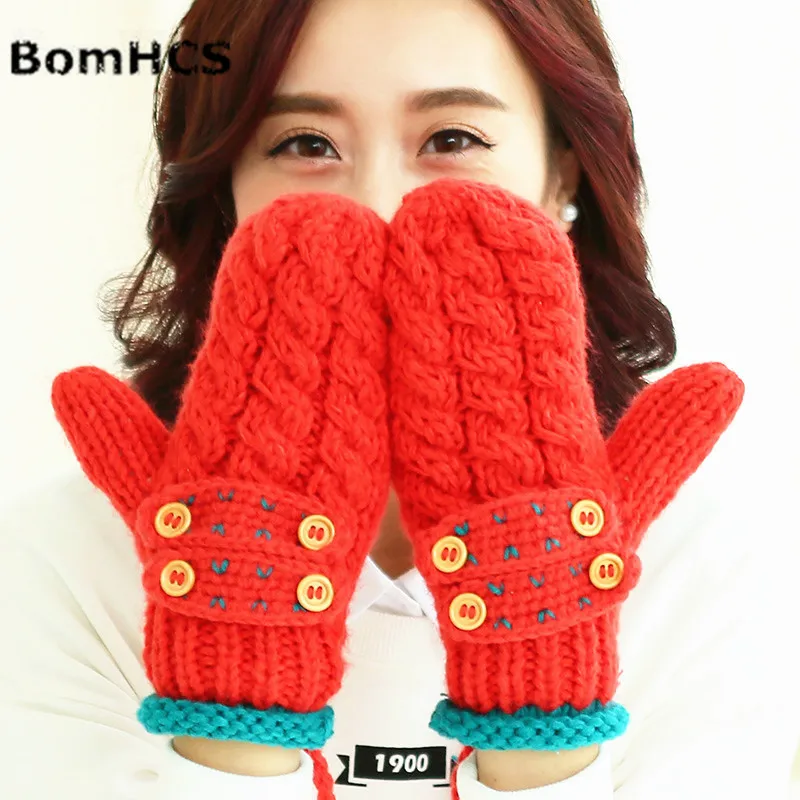 Lady Winter Warm Thick Mittens Handmade Knitted Gloves With Button