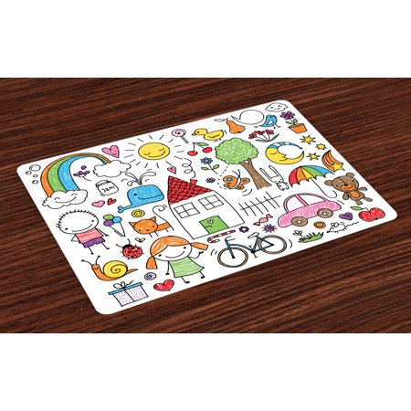 Doodle Placemats Set Of 4 Simple Childlike Drawing Of House Girl